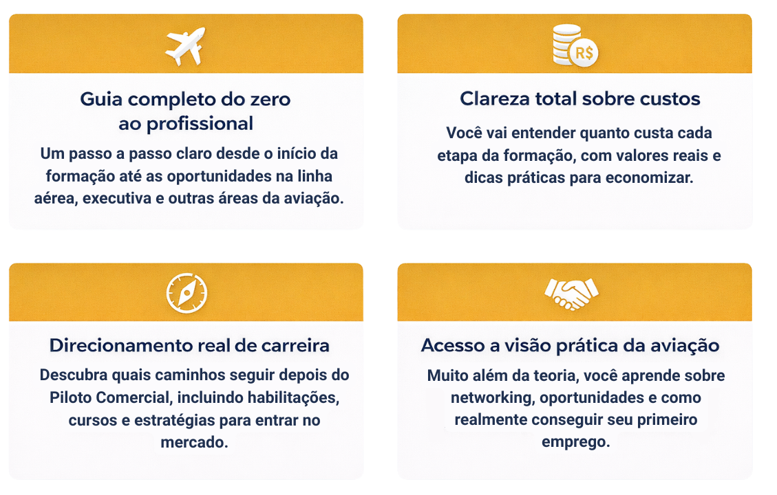 Criei esse material após receber milhares de perguntas nas minhas redes sociais, que hoje somam mais de 250 mil seguidores. As dúvidas eram sempre as mesmas: quanto custa, por onde começar, quais são os passos e como entrar na aviação.